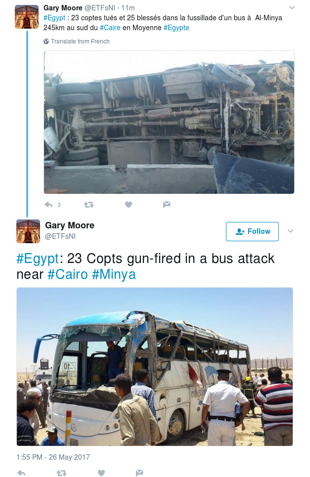 Πάντως, η κοινή γνώμη της χώρας έχει παγώσει άλλη μία φορά σήμερα με το κτύπημα εναντίον των Κοπτών, μετά τα πολύνεκρα τρομοκρατικά κτυπήματα της περασμένης Κυριακής των Βαΐων στην Τάντα και την Αλεξάνδρεια.