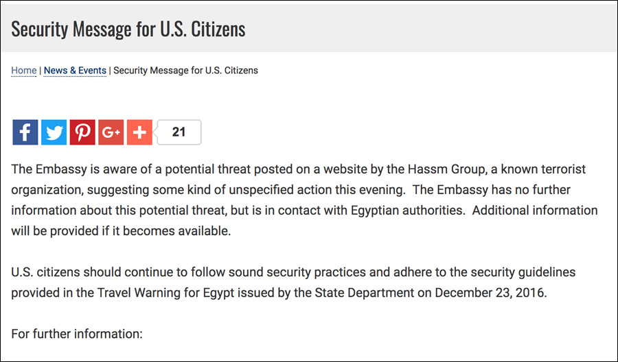 Η πρεσβεία των ΗΠΑ στο Κάιρο είχε προειδοποιήσει τη νύχτα της 24ης Μαΐου για επικείμενη, αλλά απροσδιόριστη τρομοκρατική επίθεση.
