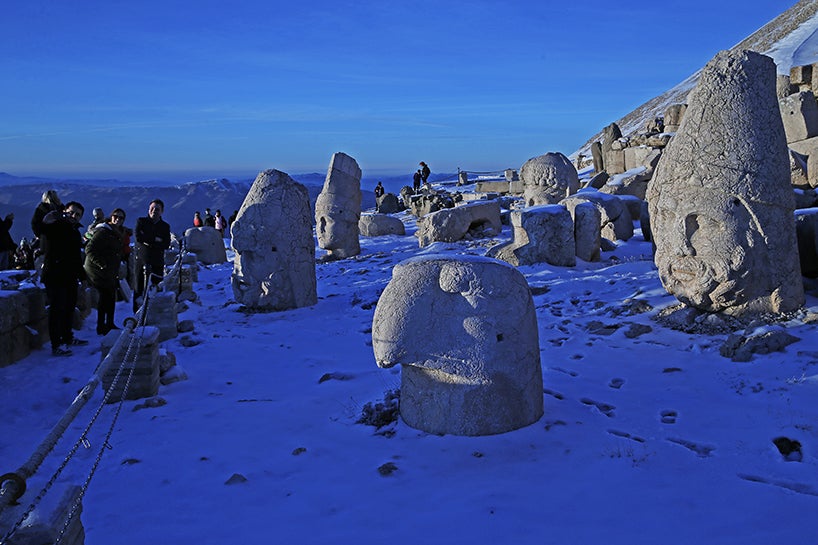 Χιόνι έχει καλύψει τα αρχαία αγάλματα στο Όρος Nemrut στην νοτιοανατολική επαρχία Adiyaman της Τουρκίας.